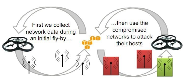 La méthode d’attaque proposée se déroule en plusieurs étapes. D’abord le drone va effectuer un vol de reconnaissance pour repérer et enregistrer les informations sur tous les réseaux sans-fil que le pirate pourrait cracker (SSID, type de cryptage, adresses MAC…) Il s’agit typiquement de réseaux ouverts, ou encore protégés par WEP ou certaines variantes du WPA. Le pirate contrôle le drone depuis un ordinateur et tous ses déplacements sont enregistrés grâce au GPS.