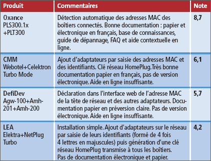 Les adaptateurs de LEA, d’Oxance et de CMM sont conformes au standard HomePlug 1.0 et intègrent un chipset Intellon à 85 Mbit/s. Les boîtiers DefiDev sont architecturés autour de puces DS2 à 200 Mbit/s.