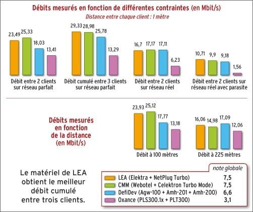 Sur un réseau électrique parfait, les meilleurs débits entre deux clients sont obtenus par les kits 100 % HomePlug de CMM et LEA (à 85 Mbit/s théoriques) avec respectivement 25, 33 et 23,49 Mbit/s. DefiDev