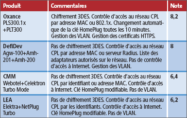 Le chiffrement proposé est en général le DES 56 activé par défaut sur tous les modèles. Chaque solution est munie d’un mécanisme de contrôle d’accès au réseau CPL soit par l’identifiant de l’adaptateur, soit par son adresse