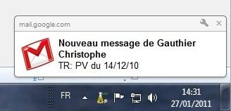 Une fonction de plus pour Gmail ! Google vient d’activer pour son service de messagerie un système de notification, qui affiche un pop-up sur le Bureau dès qu’un nouveau courriel arrive dans la boîte de réception. Ces notifications, qui existaient déjà pour les tchats avec Gtalk, doivent être au préalable activées dans les paramètres de Gmail.