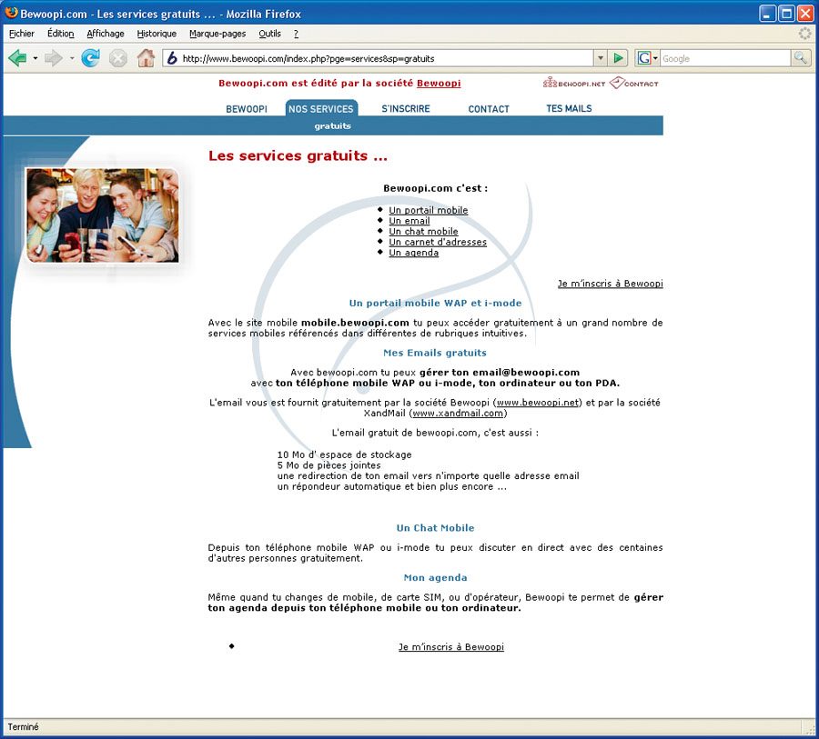 Spécialiste des services Web pour téléphones mobiles, Bewoopi enrichit son offre gratuite à destination des particuliers. Le pack e-mail inclut une adresse utilisable depuis son téléphone (WAP ou i-Mode) ou son ordinateur, avec