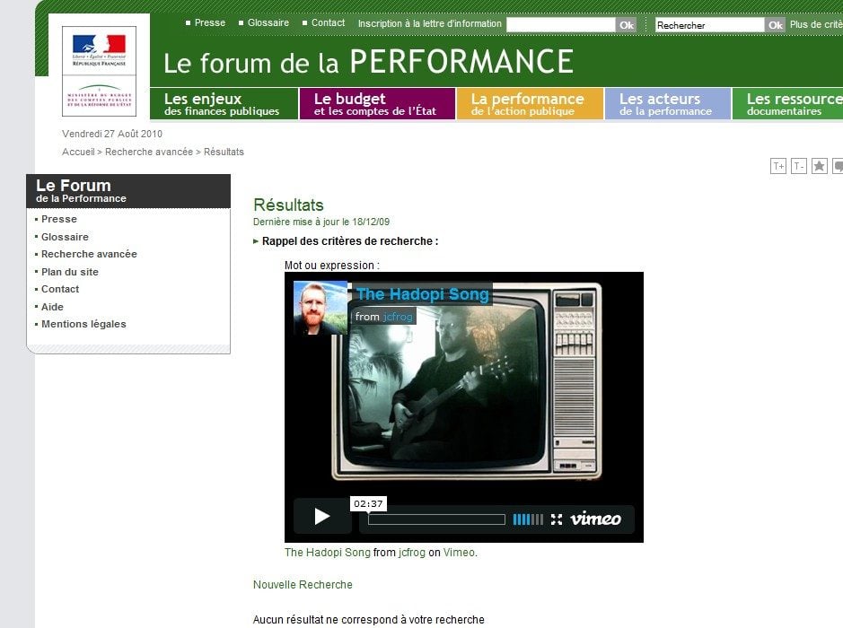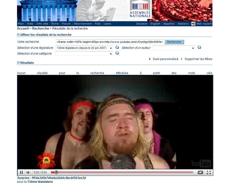 Ce matin du 27 août, il était possible d’injecter un iframe (du code « embedded ») sur un site Internet, dans le champ de recherche, pour y faire apparaître une vidéo, par exemple. Rien de bien grave, a priori (à moins qu’une telle faille soit exploitable pour modifier le site lui-même), mais les internautes anti-Hadopi ne manqueront évidemment pas de se moquer.