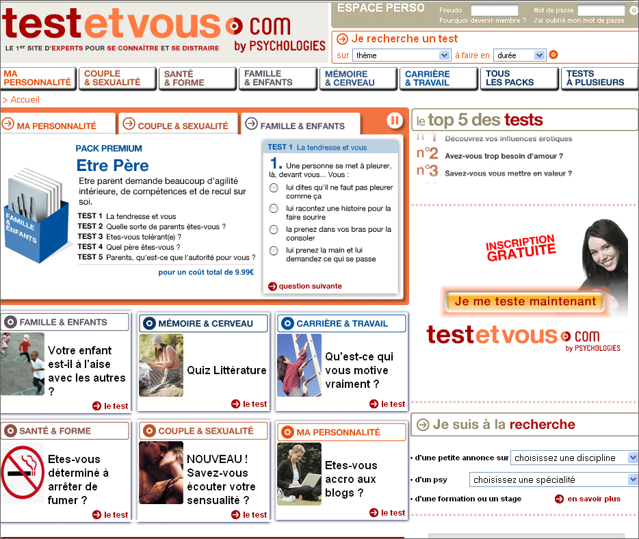 Psychologie, est pour vous. Test-et-vous se parcourt en dilettante, en picorant deci-delà des tests selon votre humeur. La plupart des questionnaires sont gratuits. Mais vous pouvez aussi acheter des packs qui comportent