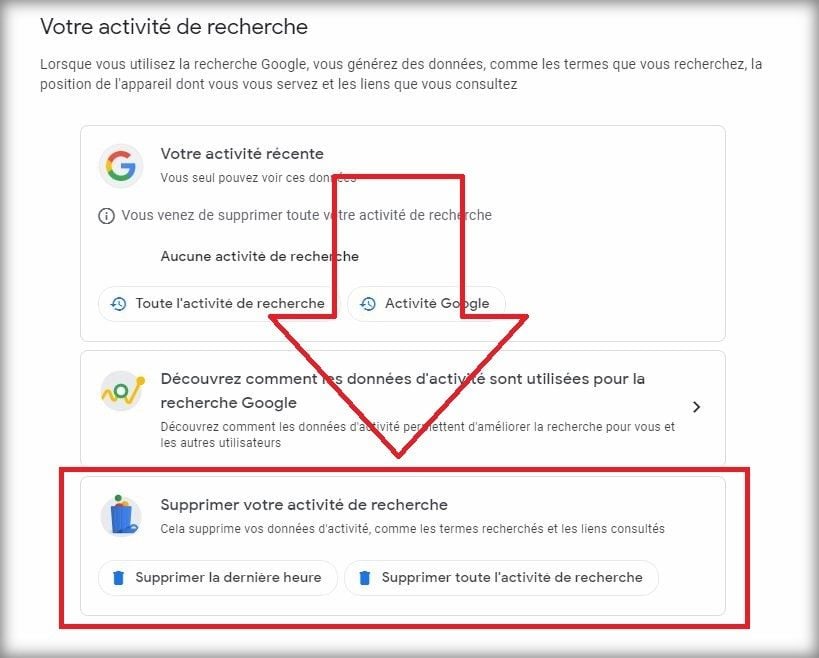 Attention, il s’agit bien ici des données stockées sur les serveurs de Google, comme les termes recherchés ou les liens consultés, et pas simplement de l’historique de navigation de votre navigateur. Une fois supprimé, ce contenu ne pourra plus être récupéré.