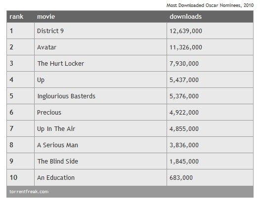 Selon ce dernier, c’est District 9 qui, des films en lice pour les Oscars 2010, remporte la première place, avec 12,6 millions de téléchargements, devant Avatar, avec ses 11,3 millions. Le long métrage de Kathryn Bigelow n’arrive qu’en troisième position, avec 7,9 millions. The Blind Side, de John Lee Hancock (avec Sandra Bullock), et An Education, de Lone Scherfig, ferment la marche, avec respectivement 1,8 million et 683 000 téléchargements. Les Inglourious Basterds de Quentin Tarantino trônent en 5e position, avec 5,3 millions.