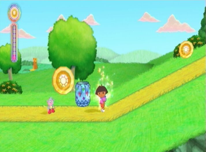 Le jeu est très intuitif : l’enfant tient la Wiimote horizontalement et, en la penchant vers la droite ou la gauche, Dora avance ou recule. Chaque fois qu’une action différente peut-être réalisée (monter à une échelle en inclinant tour à tour chaque côté de la télécommande, ouvrir une serrure en s’en servant comme d’une clé, etc.), tout sera clairement expliqué en parole et avec un petit schéma à l’écran. Pour le reste, un clic sur le bouton 2 et Dora saute ou envoie Babouche, son célèbre petit compagnon, en exploration. Dora marche, saute, fait du patin à roulettes et peut même s’envoler avec des ailes de papillons ! Et elle ne meurt jamais : au pire, elle s’arrête au bord du ravin, en équilibre instable. Tout simple et très efficace.