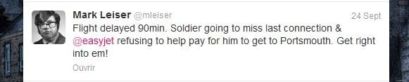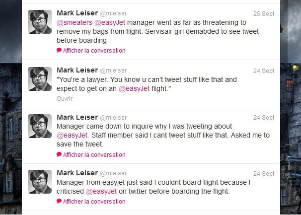 Les faits remontent à la soirée du 24 septembre. Mark Leiser attend le départ du vol Easyjet Glasgow-Londres, mais l’avion accuse un retard de 90 minutes. Ce dont il se plaint sur Twitter. L’affaire semble s’arrêter là.