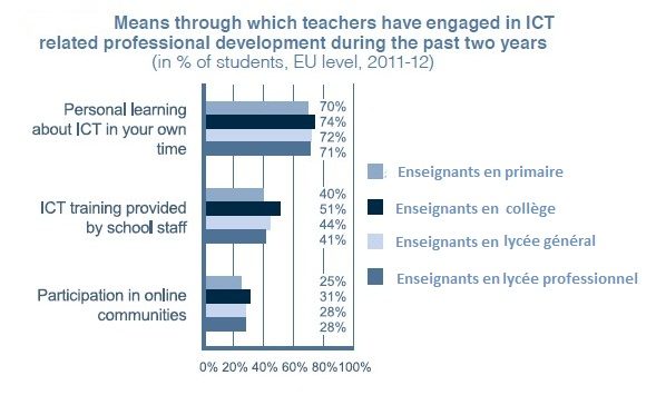 Autre point étudié par l’Union européenne, la formation et la motivation des enseignants. Ils ont généralement une vision positive de l’utilisation pédagogique des TIC et ont une attitude confiante à cet égard. Mais leur formation est rarement obligatoire. Ainsi en Norvège, 80 % des enseignants ont suivi des cours sur les TIC alors qu’ils ne sont que 10 % à avoir bénéficié d’une telle formation en France ou au Luxembourg. La plupart d’entre eux sont obligés de se former en dehors de leurs heures de travail dans le cadre d’une démarche personnelle.