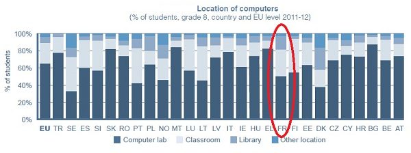 Cela fait des années que l’informatique et le numérique sont entrés dans les établissements scolaires. Le nombre d’ordinateurs à disposition des élèves a même doublé depuis 2006. Mais les petits Européens ne sont pas tous logés à la même enseigne révèle une enquête de Bruxelles sur la pénétration des technologies de l’information et de la communication (TIC) à l’école, menée durant l’année scolaire 2011-2012 et dont les conclusions ont été rendues publiques le 19 avril 2013.
