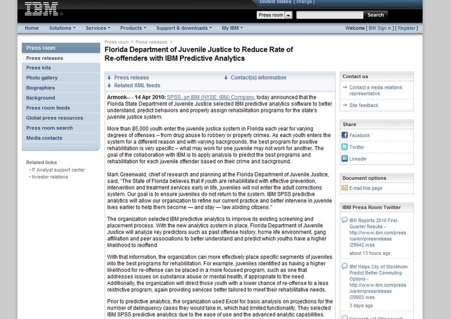 IBM SPSS a déjà signé un contrat en février avec le ministère de la Justice du Royaume-Uni, là encore pour prédire le risque de récidive de détenus.