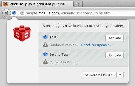 La seconde nouveauté introduit une gestion plus fine et plus sécurisée des plugins « à risque ». En effet, il arrive souvent que les plugins d’un navigateur ne soient pas à jour, ou soient reconnus vulnérable en raison d’une faille récemment découverte. Plutôt que de bloquer ces plugins par défaut, l’utilisateur peut désormais choisir, en connaissance de cause, d’activer ou non ces plugins à chaque navigation, par un simple clic. Ce qui apporte donc de la flexibilité dans l’usage quotidien du navigateur.