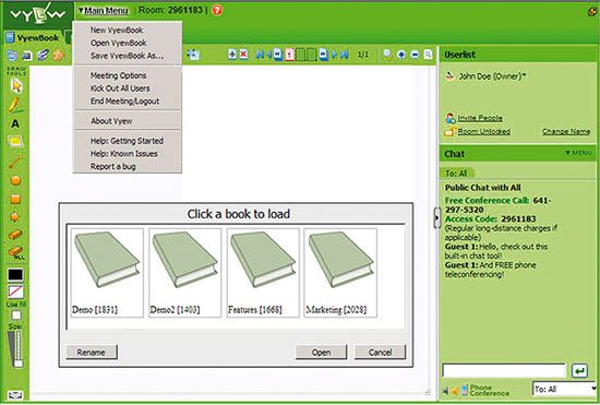 l’éditeur Vyew tente de renouveler la spécialité. Ainsi propose-t-il gratuitement une session de travail collaboratif pour 20 personnes sur le Web.Au menu, partage de documents, diffusion en streaming d’une image ‘ live ‘ de l’écran PC de l’organisateur, annotations sur les documents, commentaires, dialogue