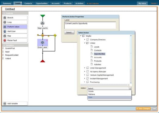 l’éditeur appelle des actions. Soit ‘ un bouton qui, quand on l’actionne, déclenche une autre action ‘. Avec Coghead, il est possible de lier facilement plusieurs applications conçues et
