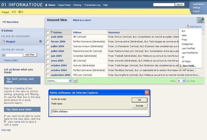 avec les données affichées dans un tableau HTML, prêtes à être réarrangées, améliorées, etc. L’ajout d’une nouvelle colonne se fait en deux clics. Des filtres d’affichage peuvent aussi être appliqués.Mais, surtout, les informations sont prêtes à être partagées. Il suffit d’inviter des utilisateurs à visiter le site http://utilisateur.dabbledb.com, et de les autoriser ou non à modifier les informations, ou encore
