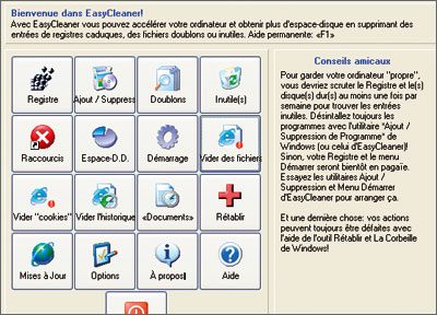 Avec le temps, Windows s’alourdit de nombreux fichiers et paramètres qui finissent par le ralentir. EasyCleaner vous aide à le nettoyer à fond sans passer par la douloureuse étape de formatage du disque dur, ni mettre les mains dans le cambouis. Pour éliminer les clés invalides du Registre, par exemple, exécutez le logiciel et cliquez sur l’icône Registre. Dans la fenêtre qui s’ouvre, pressez Trouver, patientez et cliquez sur Supprimer tout : c’est terminé ! Et si, par la suite, Windows pose des problèmes, exécutez de nouveau le logiciel et cliquez sur Rétablir puis sur Rétablir tout pour tout ramener à l’état initial.