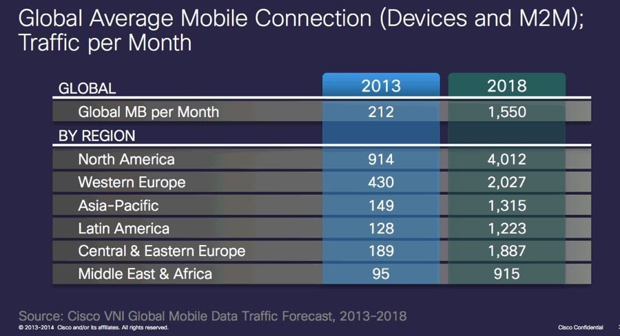 Mais les smartphones ne représenteront que 39% des connexions mobiles, derrière les tablettes et les PC portables. Cisco prévoit que les wearables devices (Google Glass, iWatch et autres), dans une mesure infime au départ, pèseront également beaucoup dans cette course en avant. Ces appareils wearables seront 177 millions en 2018 contre 22 millions en 2013 et 36 millions en 2014. La consommation de ces appareils passera de 78 Mo par mois en 2013 à 345 Mo en 2018. Sachant que l’effet 4G n’est pas encore pris pleinement en compte dans ces chiffres.