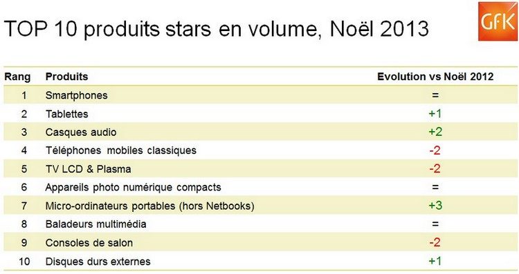 « Le vainqueur l’emporte de justesse. Alors que le smartphone est désigné comme le véritable chouchou des Français du Noël 2013, la tablette fait également l’unanimité grâce à une offre élargie adressant toutes les cibles de consommateurs avec des prix pour tous les budgets », déclare François Klipfel, directeur général adjoint chez GfK Consumer Choices France.
