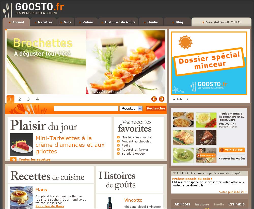 Goosto, le site consacré à la cuisine et au goût par le réseau Cnet, change de peau. Le site s’articule autour de six rubriques, des recettes, des vidéos, une rubrique vins, un blog. Les recettes y sont classées par plats, par