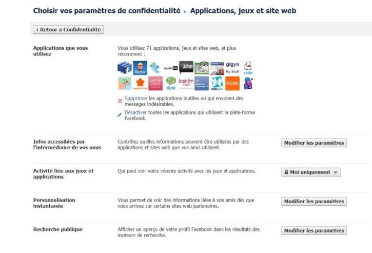 D’abord, l’apparition d’un tableau de bord (Dashboard) dans les paramètres de confidentalité, permettant de supprimer tous les sites et applications qui accèdent à vos données, voire de désactiver l’ensemble des applications utilisant la plate-forme Facebook. Très utile pour éviter de transmettre des données personnelles à des programmes ou sites indésirables.