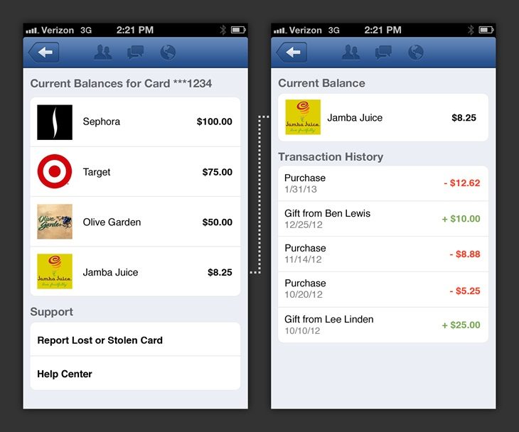 A l’occasion de l’annonce de ses résultats du quatrième trimestre 2012, Mark Zuckerberg a présenté une nouvelle carte-cadeau. Elle permet de faire des achats dans différents magasins physiques et non en ligne : Sephora (produits de beauté), Jamba Juice (restaurants de smoothies), Olive Garden (restaurants italiens) et Target (supermarchés). D’autres partenariats sont encore à l’étude.