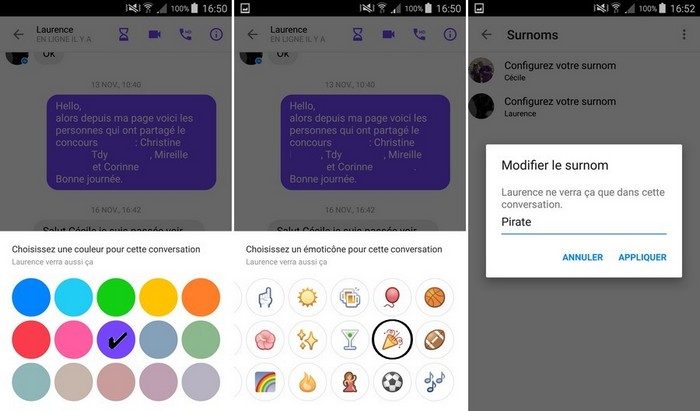Facebook propose également d’autres nouveautés pour son appli de messagerie, en lien avec les fêtes de fin d’année. Pour commencer, lorsque l’on envoie un sticker lié à cette période, des flocons se mettent à tomber du haut de l’écran. Ensuite il est possible de personnaliser l’appli en changeant la couleur, un surnom et des emojis. On peut ainsi passer son texte en vert, en violet ou en orange, et remplacer le célèbre pouce en l’air par des cotillons. Evidemment, vos interlocuteurs verront ces changements. Ces effets sont disponibles sous iOS et Android.