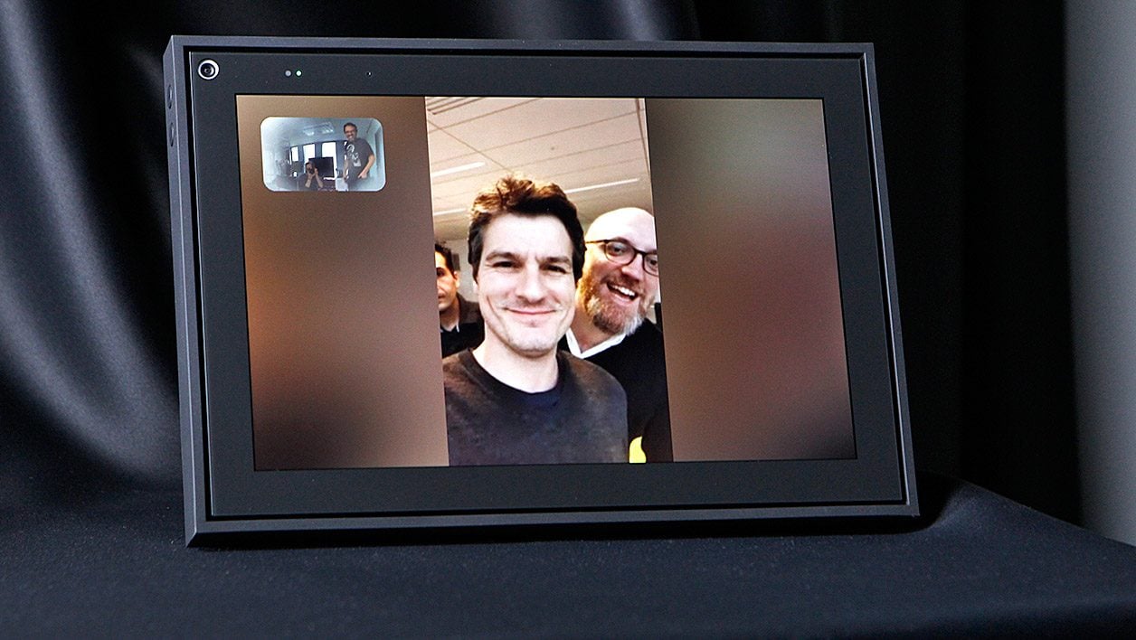 C’est la fonction clé de Portal, celle sur laquelle Facebook communique d’ailleurs pour vendre son appareil. Portal profite d’une caméra grand-angle et permet de passer des coups de fil vidéo bien plus confortablement qu’avec un smartphone, que l’on doit la plupart du temps tenir à bout de bras. Et ça marche diablement bien, que l’on utilise Facebook Messenger ou WhatsApp, les deux messageries supportées. La qualité des appels est excellente, et l’objectif grand-angle offre une vraie liberté de mouvement… D’autant que l’appareil est en mesure de vous suivre quand vous vous déplacez dans la pièce, avec de jolis effets de travelling. On se prend vite au jeu et à faire traîner en longueur nos appels en famille ! Facebook a par ailleurs ajouté à Portal une longue série de filtres et d’effets visuels amusants, qui feront forcément mouche, notamment avec des enfants.