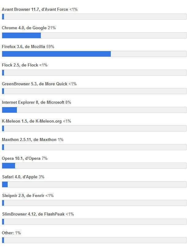 Le logiciel au panda roux laisse loin derrière Chrome 4.0 de Google, qui occupe la deuxième place avec 21 % des voix (2 300 suffrages). Il s’agit malgré tout d’un excellent score, pour un navigateur apparu récemment.