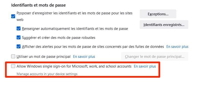 Le déploiement de cette mise à jour est aussi l’occasion pour Firefox d’inaugurer plusieurs nouvelles fonctions. Firefox 91 prend désormais en charge Windows SSO (Single Sign On), ce qui permet aux utilisateurs sur Windows ayant un compte Microsoft configuré sur leur ordinateur d’être connecté automatiquement sur les sites Microsoft. L’option doit toutefois être activée manuellement dans les Paramètres de Vie privée et sécurité du navigateur où l’option – affichée en anglais – Allow Windows single sign-on for Microsoft, work, and school accounts doit être cochée.