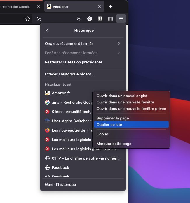 Firefox 91 dispose également d’une nouvelle option dans l’Historique, qui permet à l’aide d’un clic droit sur un site de demander au navigateur d’oublier ce site. Cette action permet non seulement de supprimer les cookies et le cache, mais aussi de supprimer le site de l’historique et d’effacer l’ensemble des données qui lui sont rattachées et qui ont été stockées localement sur l’ordinateur.