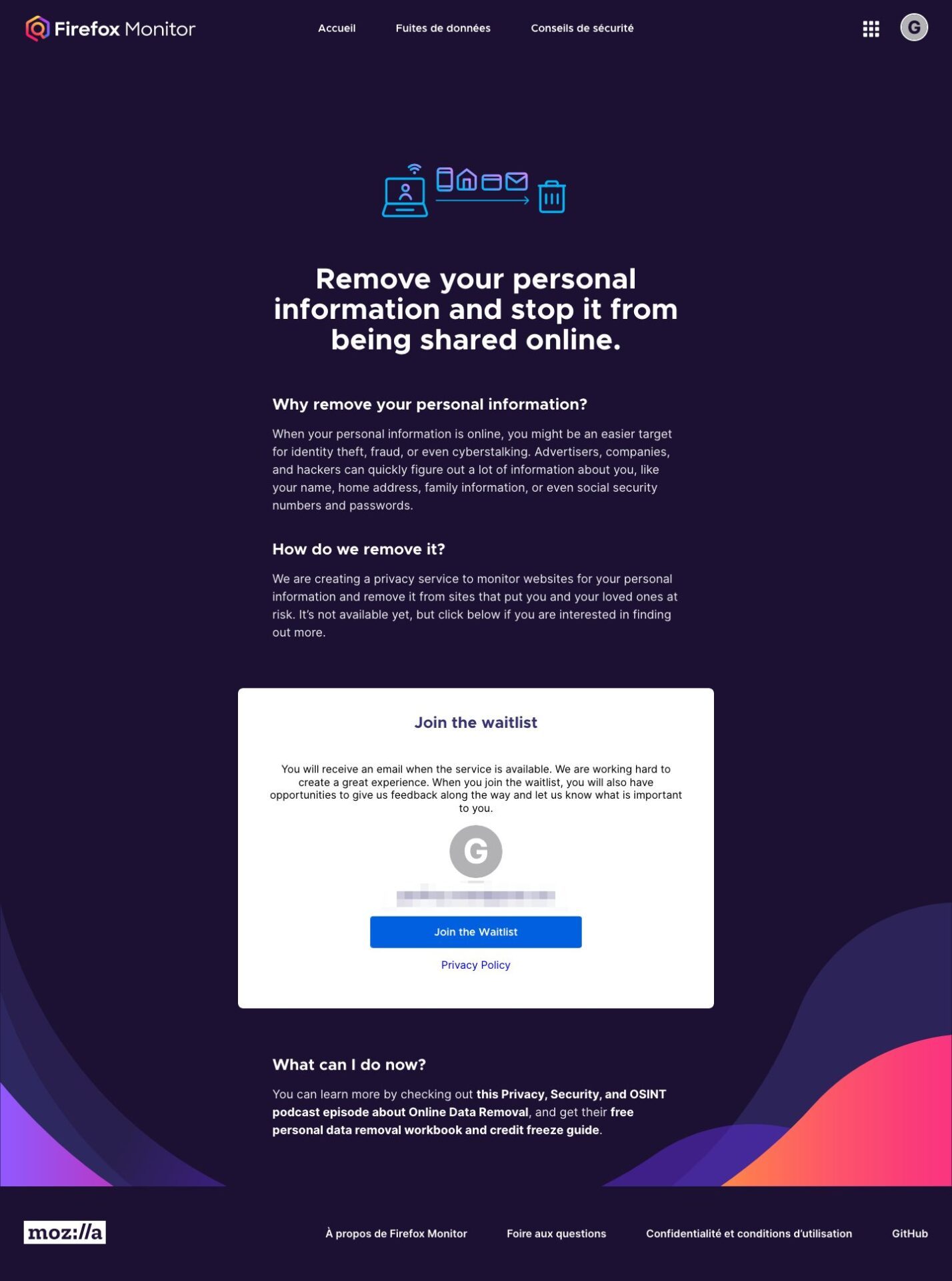 Mozilla pourrait très bientôt faire évoluer Firefox Monitor. L’outil, intégré à Firefox et qui permet de vérifier si vos données personnelles (e-mail, mots de passe, etc.) ont été compromises, pourrait bientôt aller chercher et supprimer de lui-même vos données personnelles accessibles en ligne. C’est en tout cas que ce qu’explique Mozilla sur son site dédié.