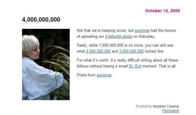 Le service de partage et d’hébergement de photos en ligne de Yahoo!, acquis en 2005, Flickr, vient d’annoncer sur son blog la publication du 4 milliardième cliché, signé Punimoe. La barre des 3 milliards avait été franchie au mois de novembre 2008, avec cette photo, celle des 2 milliards un an plus tôt, avec celle-ci. La milliardième image n’est plus accessible.