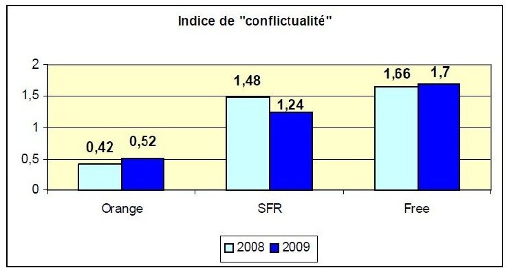 Pour Free cet indice s’élève à 1,7, un chiffre stable par rapport à l’année passée. Pour SFR, il n’est que de 1,24 et pour Orange seulement de 0,52. (voir illustration).