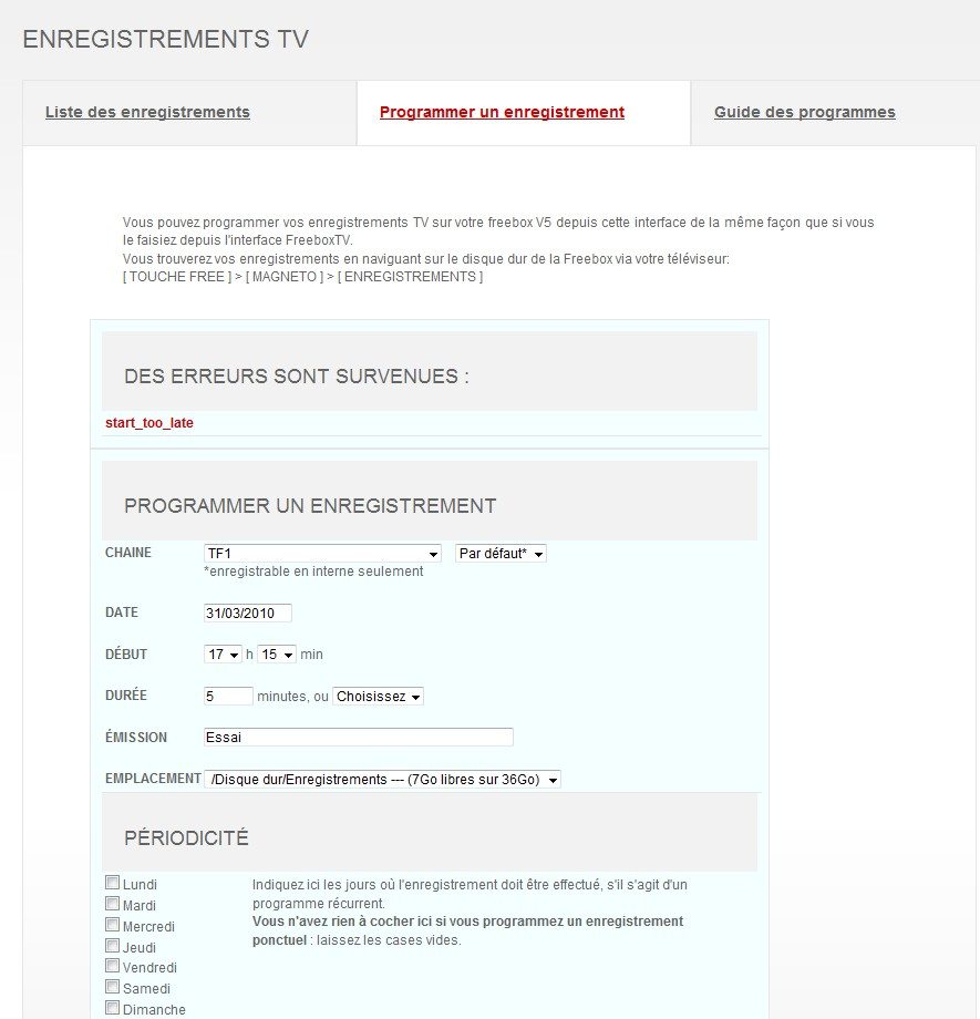 La programmation qui démarre dans l’heure suivante, elle, est tout bonnement impossible : le message « Start too late » s’affiche alors, comme le confirme notre test (voir capture écran). Interrogé sur la question, Free indique que le problème est « en cours de résolution », sans plus de précision.