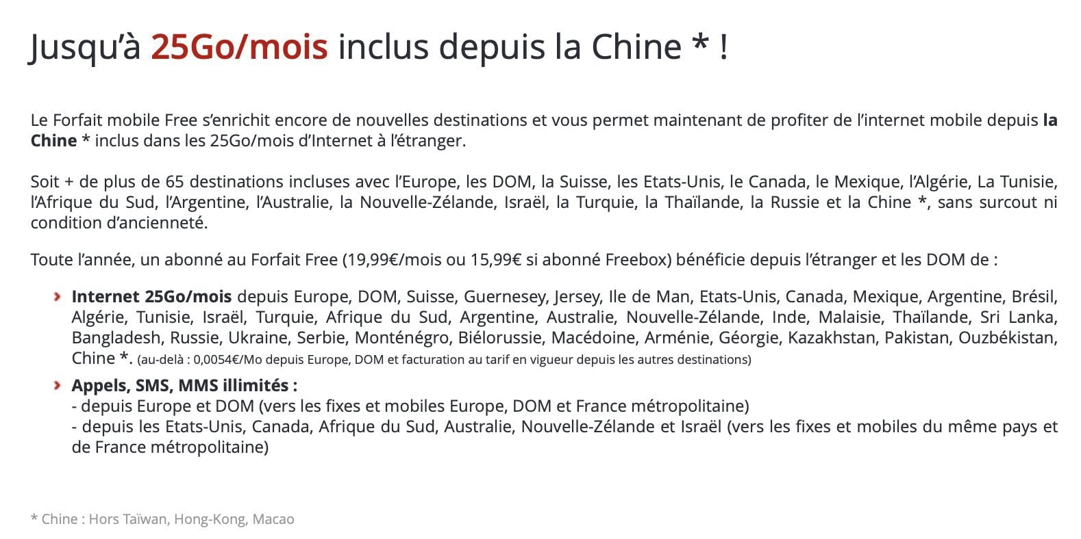 C’est une petite révolution dans le monde des forfaits low-cost, Free Mobile intègre le Chine en itinérance. Dès aujourd’hui, les abonnés d’un forfait Free à 19,99€/mois peuvent utiliser leurs 25 Go de données consacrés à l’étranger dans le pays de Huawei et Xiaomi, à condition de se contenter de 3G. Aucune des trois autres offres low-cost (Sosh, Red, B&You) ne propose d’itinérance en Chine.