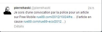 Le site d’information Rue89.com (groupe Nouvel Observateur) fait savoir que son directeur de la publication, Pierre Haski, a été convoqué par la police, dans le cadre d’une enquête suscitée par une plainte déposée par Free Mobile. Ce dernier incrimine un article publié le 16 avril 2012, sur les dessous du lancement du quatrième opérateur mobile.
