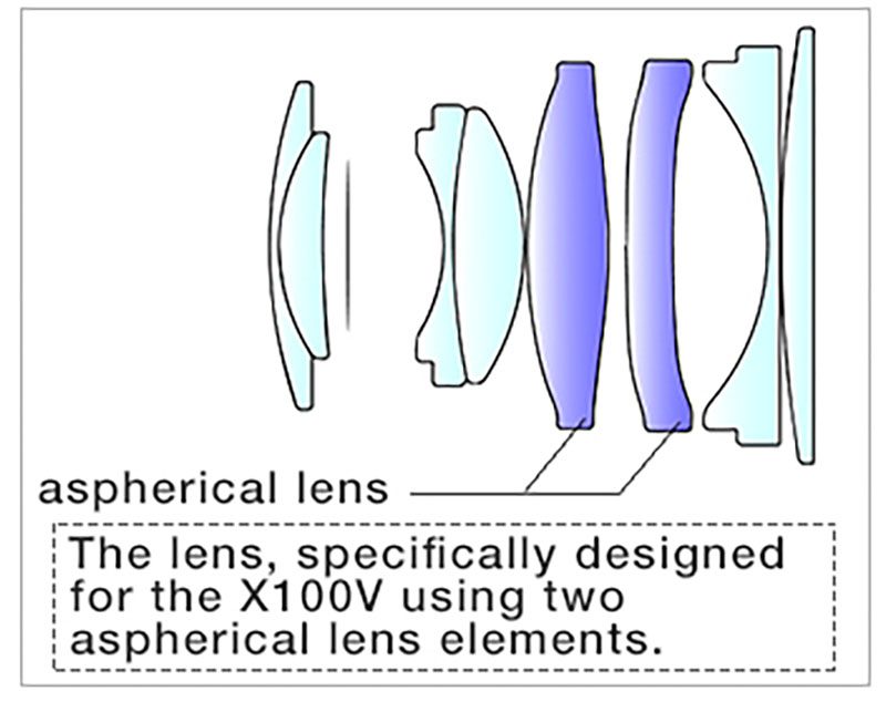 Si on a toujours droit à un 23 mm f/2.0, la formule optique a été revue et intègre désormais deux lentilles asphériques. Si les lentilles frontales et arrière semblent similaires, le groupe intérieur de quatre lentilles semble, sur les diagrammes, profondément différent. Ce qui permettrait à cette focale fixe équivalente à un 35 mm (en éq. 24×36) d’offrir à la fois « une meilleure résolution d’image, moins de distorsions et des performances de mise au point rapprochées améliorées ».