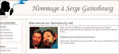 Dans ce site hommage d’un fan, le profil en ombre chinoise de Gainsbourg accueille le visiteur. C’est là le seul ornement que vous trouverez au fil de ces pages bien pâlottes. Le contenu est mieux réussi, notamment la rubrique