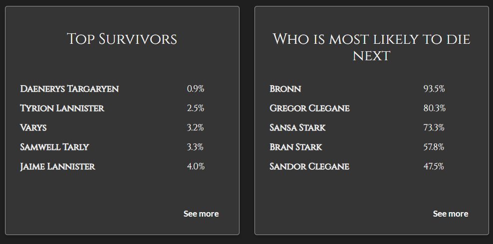 Selon l’étude, Daenerys Targaryen et Tyrion Lannister ont le plus de chances de survivre respectivement 99 % et 97 %. Mais, à l’inverse la probabilité pour Bronn de mourir est de 93,5%, celle de Gregor Clegane de 80,35%, tandis que Sansa Stark a 73,35% de risques de passer l’arme à gauche.