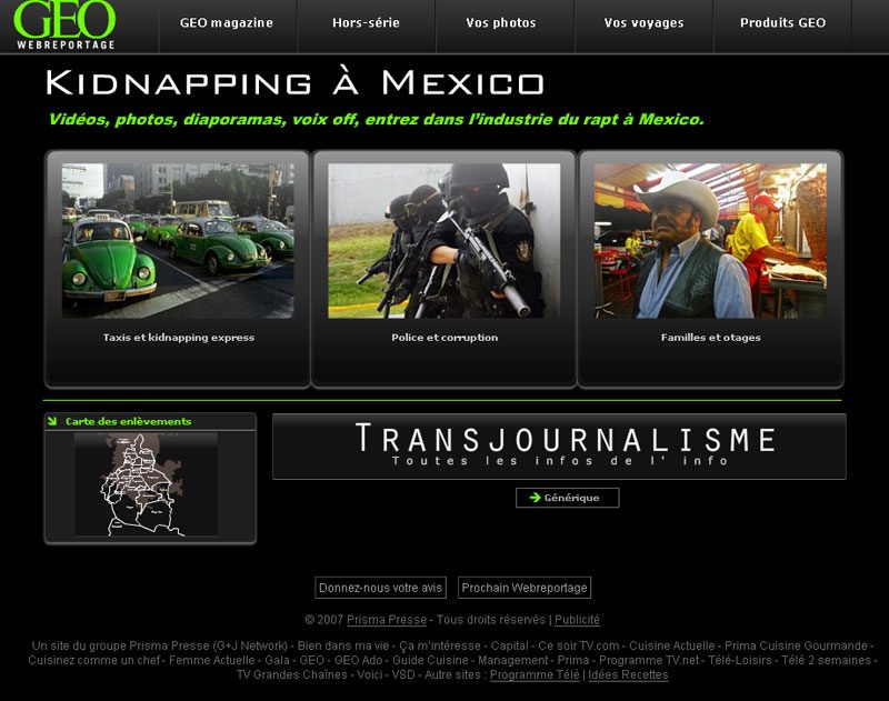 dure quatre minutes, mais avec tout le reste, vous avez une heure à passer ‘, précise Jean-Luc Marty, rédacteur en chef de GEO Magazine.Par exemple, à ce premier film sur les enlèvements dans les taxis à Mexico, GEO donne accès à une interview filmée d’un avocat, le témoignage d’un conducteur de taxi victime d’une agression dans son véhicule, et un petit reportage sur