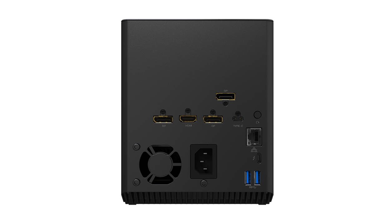L’arrière du boîtier, lui, a été usiné de façon à réorganiser les sorties vidéo. Il propose aussi d’autres prises (1 USB Type-C, deux USB 3 plein format et une prise réseau) comme c’est souvent le cas sur ce type d’accessoires. Car, pour rappel, le Thunderbolt 3 peut véhiculer des données, en même temps que le flux de pixels ou indépendamment de celui-ci.