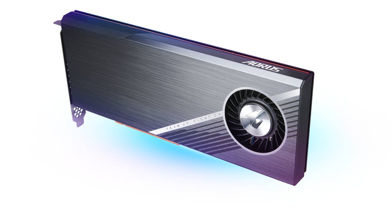 Il s’agit du SSD Aorus Gen4 AIC 8 To, une solution de stockage qui – de loin – pourrait faire penser à une carte graphique. Elle en a la forme, l’interface de connexion et, surtout, le dispositif de refroidissement : un carter sous lequel se cache le radiateur et qui, grâce à un orifice, donne la vue sur le ventilateur.