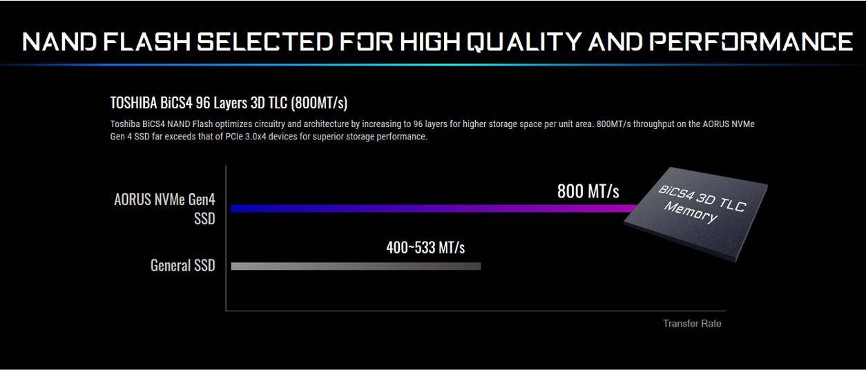 Gigabyte annonce des vitesses d’écriture et lecture séquentielles pouvant atteindre jusqu’à 15 000 Mo/s. Les quatre modules SSD de 2 To branchés à la carte sont tous de type M.2 NVMe (Toshiba BiCS4 3D TLC) et interfacés en PCIe 4.0. Gigabyte précise qu’il est possible de remplacer les modules présents par d’autres de plus fortes capacités lorsque le besoin s’en fera sortir.