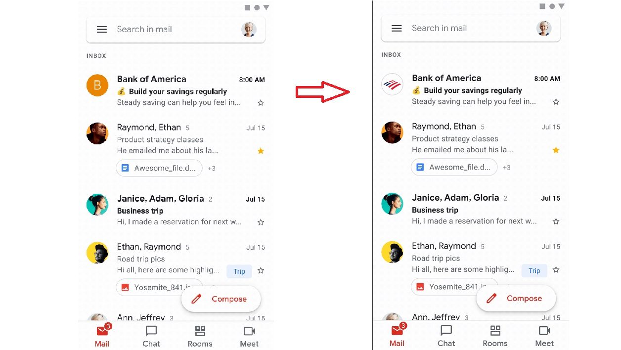 Grâce à ce procédé, une entreprise ou une marque peuvent remplacer l’avatar générique utilisé dans Gmail par leur propre logo. L’image ci-dessous montre un exemple avant/après avec la Bank of America, qui fait partie des partenaires de Google pour le lancement de cette nouvelle fonction.