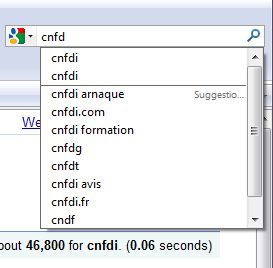En tapant le nom de la société dans le moteur de recherche, les utilisateurs se voyaient suggérer les termes « CNFDI arnaque ». A ce jour, le 7 janvier 2010, l’association apparaît encore dans Google Suggest (voir capture).