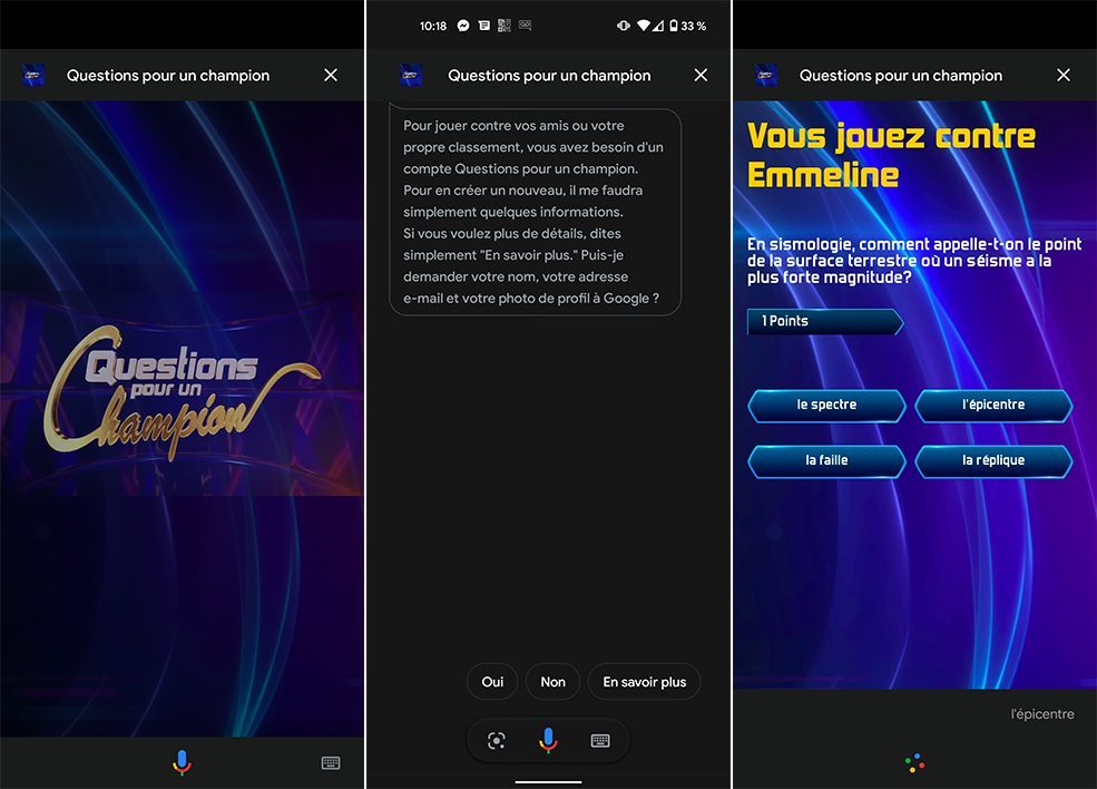 « OK Google, je veux jouer à Questions pour un Champion ». En prononçant cette phrase toute simple à une enceinte Google Home ou à un appareil Android, on peut désormais participer gratuitement à un quiz à cinq questions. C’est la voix de Samuel Etienne, le présentateur du jeu de France 3 qui s’occupe de la narration tandis que la voix de l’assistant Google prend le relai pour vous poser des questions.