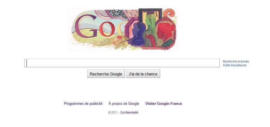 Ce 8 mars 2011 marque la Journée internationale de la femme, idée née en 1910 et officialisée en 1977 par les Nations unies (voir le site dédié à cette journée et à son histoire, où l’on apprend qu’il a fallu attendre 1982 en France pour la voir célébrée). A cette occasion, Google a créé un logo spécial (un Doodle) en hommage aux femmes, dans un style très art déco.