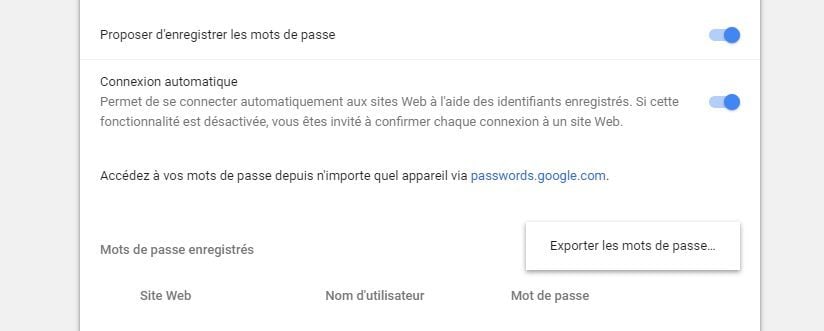 Autre fonction maintenant disponible, l’exportation des mots de passe stockés dans le navigateur sous forme de tableur (format .csv). Prenez garde cependant, comme le rappelle Chrome lorsque vous lancez cette procédure, toute personne susceptible d’avoir accès au fichier pourra alors voir vos petites expressions ou phrases secrètes…