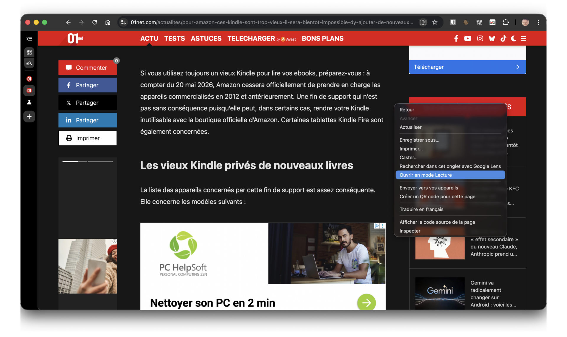 L’autre grande nouveauté introduite dans Chrome 147 concerne le mode lecture. Cette fonction permet de reformater le contenu d’une page pour l’afficher dans un environnement dénué de distraction. Jusqu’à maintenant, le mode lecture disponible dans Chrome affichait le contenu dans un volet qui s’ouvrait à droite dans la fenêtre de navigation. Désormais, le mode lecture de Chrome se veut plus immersif et s’ouvre automatiquement en plein écran dans le navigateur.