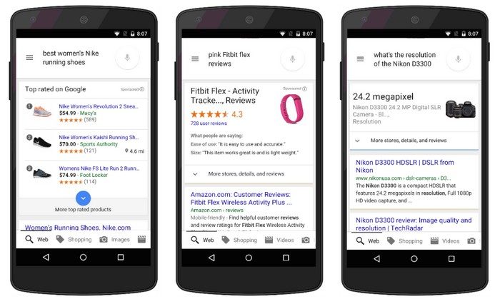De manière complémentaire, les réponses à des recherches sur les meilleurs produits font désormais apparaître des classements et des notes. D’après la firme de Mountain View, le nouveau design des réponses a entraîné une hausse de 11 % du taux de transformation d’une recherche en achat.